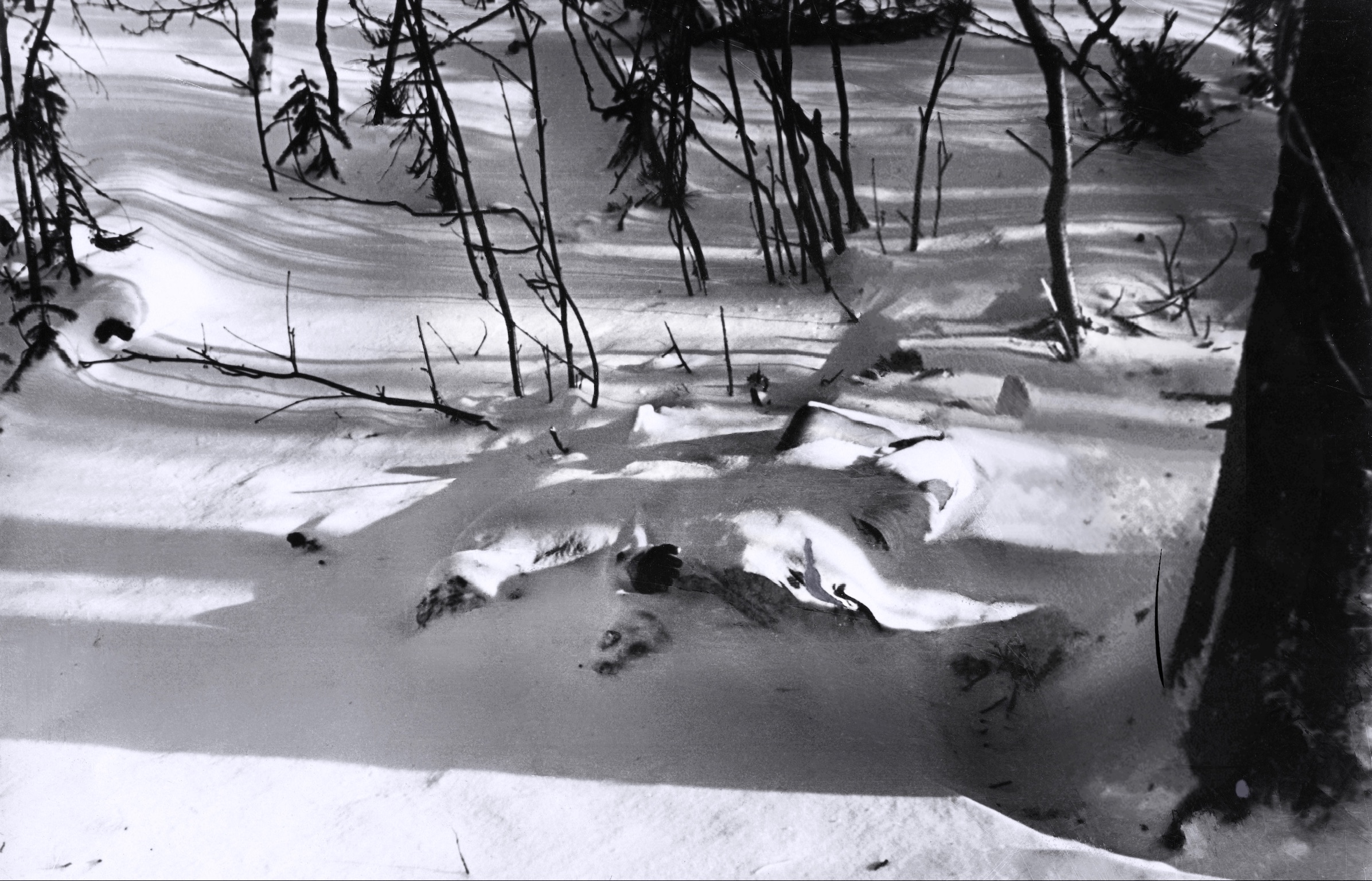 На фото обнаружения тел у кедра можно увидеть первый контрастный репер в виде поднятой вверх руки Георгия Кривонищенко. Случайно или преднамеренно, но именно эта рука оказалась «окрашенной» в чёрный цвет термического ожога. Очевидно, что такая «черная метка» на белом и чистом снегу, рано или поздно должна была привлечь чьё-то внимание. Нам доподлинно неизвестно, что первое бросилось в глаза поисковикам, однако есть одно интересное воспоминание. М. Шаравин: «буквально метров 10, так 15, не доходя до кедра…видим что-то черное… одеяло было наверху». Никакого одеяла там не было, но вот «что-то черное» поисковик запомнил. Более того, он же запомнил и то, что «у Дорошенко руки по локоть были черными». Эта немаловажная деталь должна заинтересовать вдумчивых и внимательных аналитиков, потому что кисть руки Георгия и чёрный тыл внешней стороны локтевого сустава Юры находятся рядом,- на одной прямой.